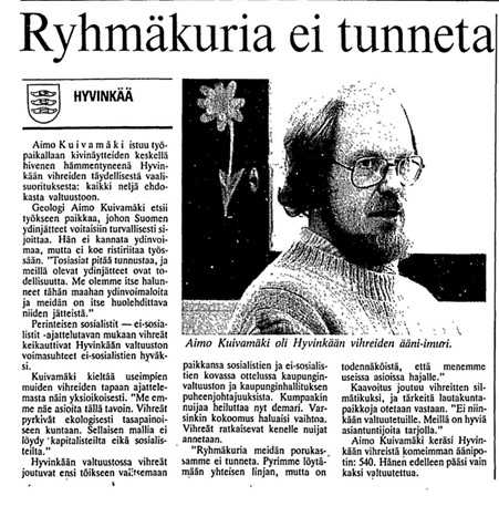 Lehtileike: Helsingin Sanomat 24.10.1984: Ryhmäkuria ei tunneta. Haastattelussa Hyvinkään vihreiden Aimo Kuivamäki