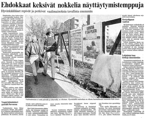 Hyvinkäällä revittiin ja potkittiin vaalimainoksia 80-luvulla. Helsingin Sanomat 17.10.1988