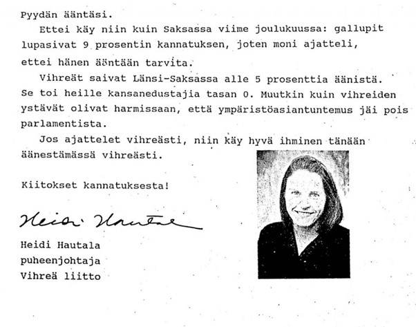 Osa vihreiden vaalimainoksesta Helsingin sanomissa, maaliskuun 17. v. 1991