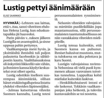 Eduskuntavaaleissa 2011 paikallinen ehdokkaamme oli Helena Lustig, joka sai 1355 ääntä.