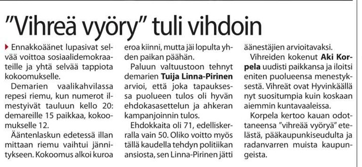 Helsingin sanomat kertoi Hyvinkään vihreiden upeasta vaalituloksesta 24.10.1984